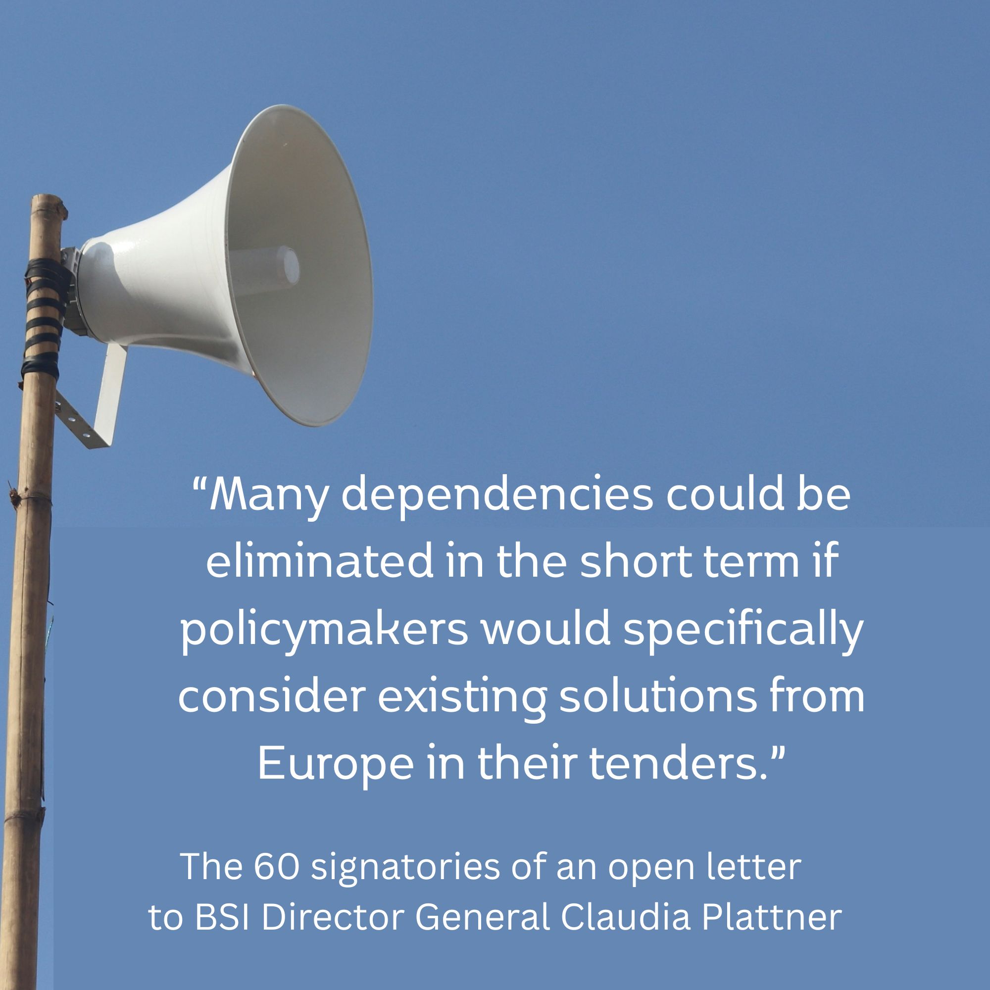 We refer to your statements to the German Press Agency (dpa), which were published in many media outlets. Your description of the current situation is correct in parts: Germany is dependent on US providers in key areas, and in the short term, more control and risk mitigation are obviously necessary. However, digital sovereignty is achievable and is a prerequisite for our security, economic strength, and the independent shaping of our future. If we constantly struggle with damage control alone, we will not be able to escape the predicament of overwhelming dependencies.